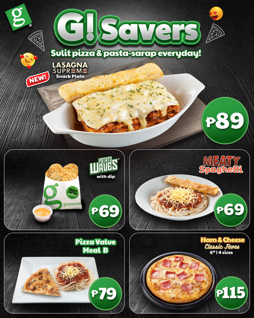 On a tight budget but G for a food trip? We’ve got you covered! Greenwich—the number one pizza chain in the country—is introducing G! Savers that offer value-for-money, delicious snacks for your everyday pizza and pasta cravings. Starting at P59, G! Savers lets you experience what ‘sulit pizza and pasta sarap’ is all about while staying on top of your budget.